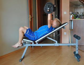 8. Отжимания от скамьи на трицепс. Прямые руки на опору за спиной, а ноги на опору перед собой на такой же высоте (например 2 стула). Сгибаем руки в локте до угла в 90 градусов и затем выпрямляем. Не стоит каждое выпрямление доводить до конца - "втыкать" локтевой сустав, это не хорошо. Эта рекомендация относится практически ко всем упражнениям - почти доводим, но не "втыкаем". Упражнение со своим весом и тут в двух подходах нужно оставить все силы. Если у ребенка получается выполнить очень много (за 40-50 раз) в каждом подходе, можно положить на ноги отягощение. Трицепс работает интенсивно, но задействован и низ грудных мышц.