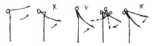 На махе вперед положение тела то же, что и на махе назад. Не следует поднимать голову, создавать угол в плечевых суставах, сгибаться или прогибаться. Как на махе назад, ученик должен полностью видеть свое тело.