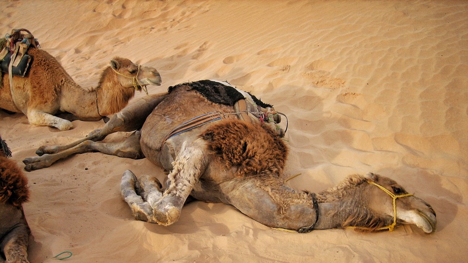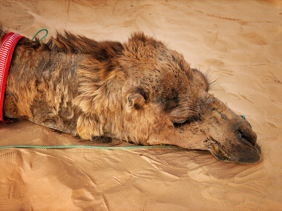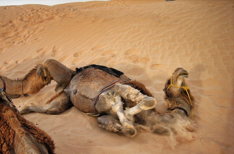 Верблюды являются очень миролюбивыми и добродушными животными, а слухи о том, что они плюются весьма преувеличены. Хотя, вполне возможно, что для туристов подбирают спокойных животных. В спокойном состоянии верблюды обычно лежат и кажутся совсем невысокими животными. Лежачие верблюды сравнительно компактны, ведь свои длинные ноги они подворачивают под себя так, что вместе с туловищем образуют единый комок. Может таким образом, верблюдам удается лучше переносить песчаные бури, так как их меньше продувает. Если обратить внимание на мышцы верблюда, то можно заметить их мощь и силу. Когда верблюды поднимаются и становятся на свои ноги, то сразу видно, какие они на самом деле высокие. Особенно это ощущается, если взобраться на верблюда. Желания спрыгнуть не возникает, тем более песок в пустыне отличается от пляжного, ведь он не такой мягкий, а, наоборот, спрессован почти как асфальт.
