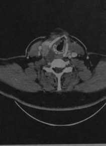КТ с контрастированием : рак щитовидной железы на уровне щитовидного хряща справа. Опухоль имеет сложную структуру и включает зоны некроза, имеющие пониженную плотность, участки кровоизлияний, имеющие повышенную плотность и участки с интенсивным усилением после введения контраста. Опухоль смещает вперед гортань и нервно-сосудистый пучок. Кпереди от опухоли заметен дефект кожи.