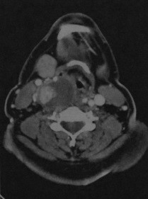 КТ с контрастированием: обширное вертикальное распространение рака щитовидной железы в направлении головы. Опухоль содержит кистозные участки сниженной плотности, зоны кровоизлияний, имеющие повышенную плотность, и участки интенсивного усиления. В правой поднижнечелюстной области непосредственно кпереди от опухоли определяются крупные метастазы в лимфатические узлы.