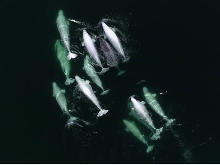 Исследователи из группы по мониторингу передвижения китов в реке Святого Лаврентия, что на северо-востоке Канады, засняли с помощью дрона группу китов-белух, среди которых плавал взрослый нарвал.