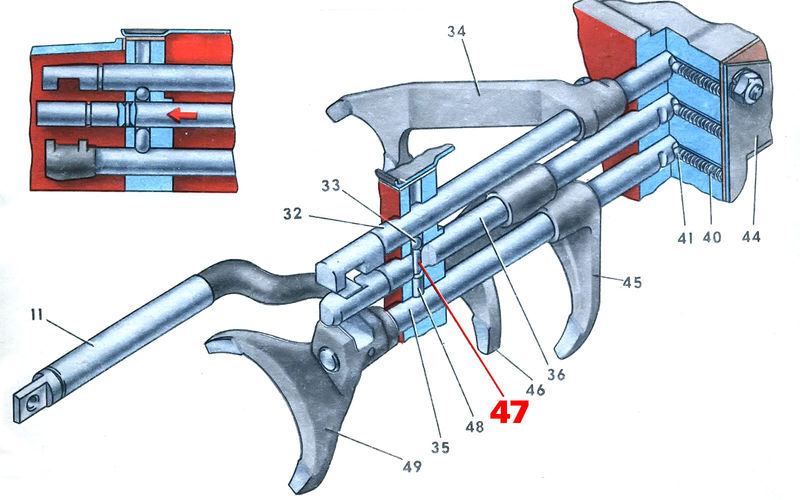 Утром благополучно доехали до места, набрали грибов. Разворачиваемся ехать обратно. И тут коробка застревает на второй передаче. Мы и так, и сяк — ничего. На второй передаче, разгоняясь и выжимая сцепление на спусках, добрались до гаража. В железном ведре, в котором промывали в керосине детали, обнаруживаем детальку (под номером 47 на схеме). Это толкатель замков, он предотвращает одновременное перемещение штоков включения передач и прячется в штоке вилок первой и второй передач. У нас же штоки сдвинулись одновременно, и коробка застряла на второй.