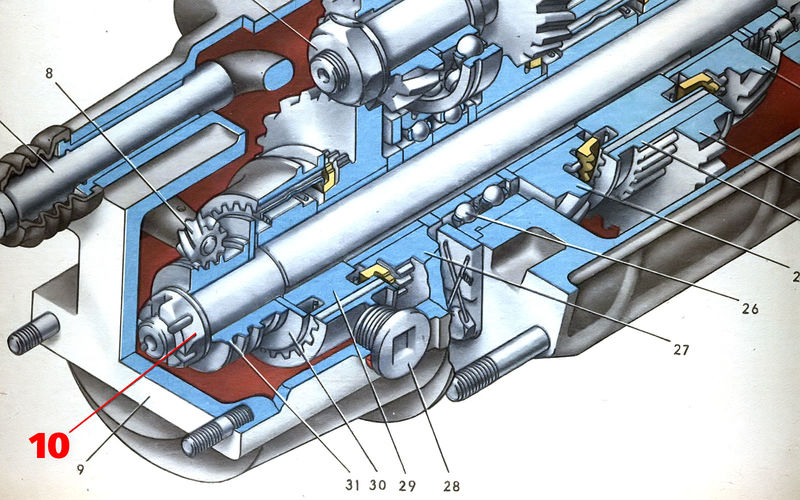 Виной тому оказалась ослабшая гайка ведущего вала главной передачи. Дело в том, что шестерня тросового привода спидометра на 30-сильной версии установлена на круглом, без единой зацепки, ведущем валу главной передачи и удерживается от проворачивая только за счет стяжки, обеспечиваемой гайкой (на схеме она фигурирует под номером 10). Постепенный износ деталей плюс повышение рабочей температуры привели к тому, что при уменьшении вязкости масла шестеренка спидометра стала проскальзывать. Косые зубья четвертой скорости при разнонаправленных нагрузках то зажимали, то ослабляли стяжку деталей на валу главной передачи. Проблема решилась при затяжке злополучной гайки с нужным моментом.