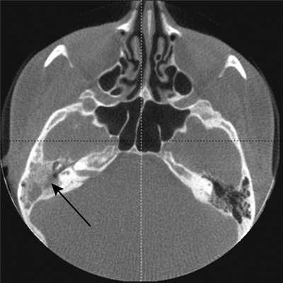 Дифференциальный диагноз злокачественной опухоли височной кости по данным КТ проводится с холестеатомой, невриномой лицевого нерва, гломусной опухолью.