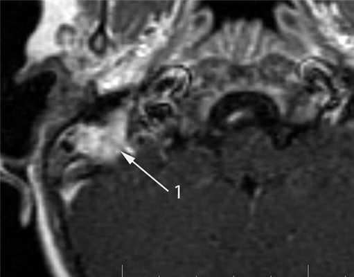 Недостатком КТ в диагностике опухолей среднего уха является низкая контрастность в изображении мягких тканей. В связи с этим существенную роль в диагностике опухолей среднего уха играет МРТ, которую используют для детальной оценки мягкотканных изменений. Эта методика позволяет выявить гетерогенный характер злокачественной опухоли, а также диагностировать распространение опухоли за пределы височной кости как экстра-, так и интракраниально. МР-характеристики злокачественных опухолей не являются специфичными: в Т1-изображении они имеют промежуточный сигнал, в Т2 — высокоинтенсивный сигнал, характерно значительное усиление сигнала после внутривенного введения контрастного агента [6, 7] (рис. 8). Рисунок 8. Лангергансоклеточный гистиоцитоз. МРТ в режиме Т1 после внутривенного контрастирования, коронарная проекция. В сосцевидном отростке определяется опухоль, активно накапливающая контрастный агент (1).