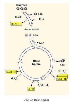 До цикла Кребса пируват декарбоксилируется и дегидрируется. В результате декарбоксилирования отщепляется молекула CO2, Они соединяются с НАД.