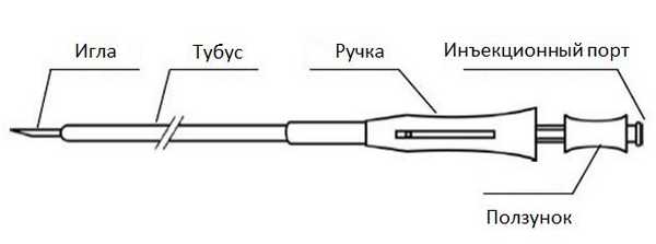 - ползунка (с его помощью контролируется положение иглы. При введении в канал эндоскопа, игла должна быть внутри тубуса, во время инъекции игла выдвигается с помощью передвижения ползунка вперед);