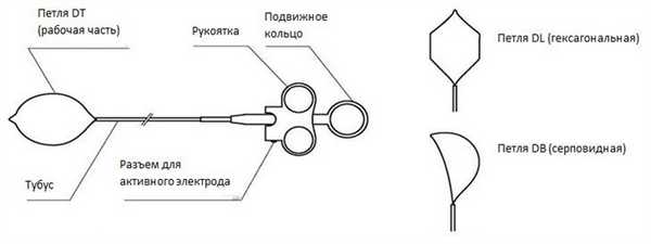Конструкция петли представляет собой саму петлю/петли, через которую проходит коагуляционный ток высокой частоты, пластмассовую трубку (тефлоновый тубус) и рукоятку.