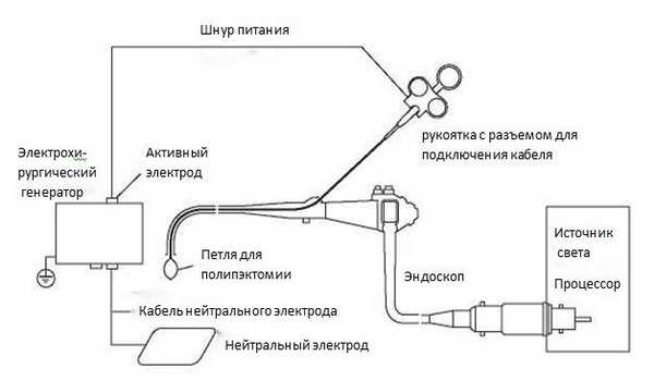 При удалении полипа на длинной ножке на полип (ближе к его головке) накладывают петлю, затягивают ее, и отсекают, изменяя режимы коагуляции и резания. Подавать ток надо не более 2-3 секунд с перерывами в 1-2 секунды, при этом постоянно перемещая головку полипа, чтобы избежать ожога стенки органа.