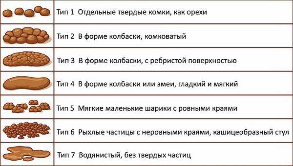 Чтобы кал полностью прошел по кишечнику, надо минимум 20 часов и максимум 3 суток. Когда кал находится в толстой кишке дольше — он становится твердым, похожим на «овечий». Поэтому если вы посещаете туалет реже, чем раз в 3 дня, и кал похож на первые 2 картинки— это запор. Посмотрите, какой кал считать нормальным (тип 3 и 4):