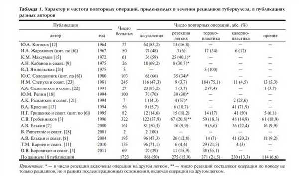 Чаще всего в лечении послеоперационных рецидивов туберкулеза используются такие оперативные вмешательства, как пневмонэктомия (удаление ранее резецированного легкого) и экстраплевральная торакопластика (табл. 1 ). Обобщив литературные публикации 18 авторов о хирургическом лечении 1723 пациентов с рецидивами туберкулеза, мы подсчитали, что до удаления легкого у половины оперированных (50%) были выполнены экстраплевральная торакопластика - у 371 (21,5%), резекции ранее оперированного или противоположного легкого - у 275 (15,9%) и кавернопластики - у 230 (13,3%) [3, 5-9, 11-13, 15, 18, 21-23, 26, 28], другие виды операций - лишь в 6,6% случаев.