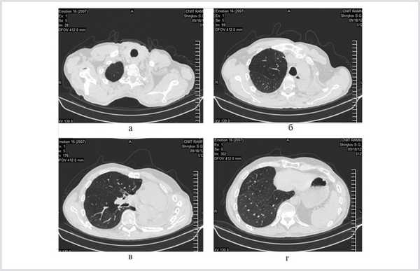 При компьютерной томограмме выявлены цирротические изменения левого легкого с обширной полостью эмпиемы и множественными мелкими полостями в коллабированном легком. Правое легкое уменьшено в объеме за счет фиброзных изменений верхней доли, в которой определялись три каверны диаметром до 2 см, имелось очаговое обсеменение нижних долей (рис. 1).