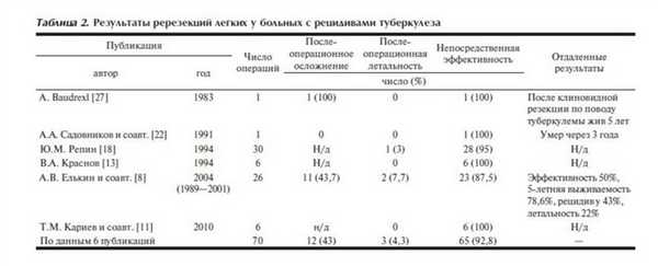 В целом ререзекции применяются по поводу рецидивов туберкулеза крайне редко. Нами найдено лишь 6 публикаций [8, 11, 13, 18, 22, 27] за последние три десятилетия, в которых приводились результаты этих операций раздельно от других повторных операций (табл. 2 ) и описывались в общей сложности последствия 70 ререзекций. Однако суммарное число этих вмешательств, скорее всего, еще меньше, поскольку при описании наибольших групп этих операций в разные годы сотрудниками Санкт-Петербургского НИИ фтизиопульмонологии (Ю.М. Репин - 30 случаев [18], А.В. Елькин и соавт. - 26 случаев [8]) в последней публикации, обобщающей материал с 1989 по 2001 г., по видимому, частично включены и больные, описанные в 1994 г. [18].
