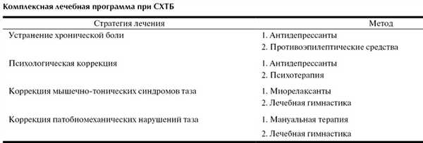 Лечение СХТБ - сложная проблема, поскольку попытки определить патофизиологические причины возникновения данного заболевания часто неудачны. В большинстве случаев как основной этиологический фактор рассматривают воспаление органов малого таза (хронический цистит, простатит), так как все симптомы, описываемые пациентами, указывают на наличие именно воспалительного процесса [20]. Принимая во внимание многофакторный характер патогенеза хронических тазовых болей, нами применяется комплексная лечебная программа, ключевые звенья которой представлены в таблице [7, 9].