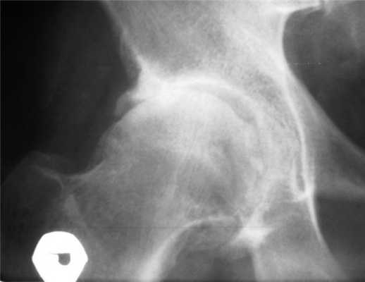 Пациент М., 56 лет, обратился к неврологу с жалобами на боли (до 8 баллов по визуальной аналоговой шкале боли — ВАШ) в правой паховой области, ягодице, передненаружной поверхности ноги до лодыжки, резко усиливающиеся при опоре на ногу. Считает себя больным в течение 2 лет, когда появилась боль в ягодице и наружной поверхности ноги, иногда — в паховой области. Рентгенологическое исследование поясничного отдела позвоночника выявило признаки остеохондроза. Неоднократно по поводу диагностированной неврологом люмбоишиалгии получал НПВП короткими курсами, витамины группы В, физиотерапию с временным положительным эффектом. В течение последних месяцев боль усилилась до интенсивной, преимущественно локализовавшись в паховой области. При осмотре неврологической патологии выявлено не было; другие хронические заболевания отсутствуют. Пальпация проекции щели правого тазобедренного сустава вызывает интенсивную боль. Ортопедический осмотр: резкое ограничение движений в правом тазобедренном суставе; положительные тесты на патологию сустава — Патрика, Дрэхмана, «захвата» Томаса, «наковальни»; движения в пояснице безболезненные. Рентгенологические признаки коксартроза 3—4-й стадии (см. рисунок). Рентгенограмма тазобедренного сустава пациента М. Последующая консультация ортопеда показала необходимость эндопротезирования сустава.