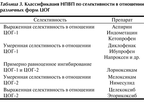 В зависимости от степени угнетения двух основных изоформ циклооксигеназы (ЦОГ), НПВП подразделяют на селективные и неселективные. Основные препараты, классифицированные по селективности, представлены в табл. 3 [12]. Таблица 3. Классификация НПВП по селективности в отношении различных форм ЦОГ