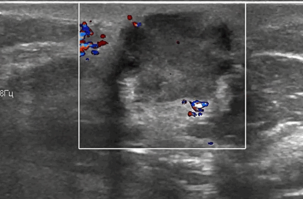 При диффузной форме рака цветное и энергетическое допплеровское картирование выявляют сосудистые сигналы, расположенные хаотично во всех квадрантах пораженной грудной железы на фоне расширенных лимфатических сосудов.