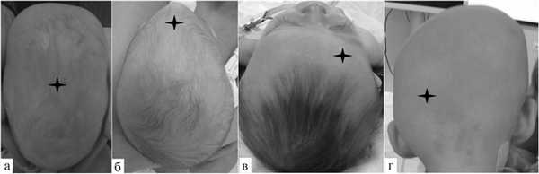 К НеКС относят скафо- (зарастание сагиттального шва) (рис. 1, а), тригоноцефалию (зарастание метопического шва) (рис. 1, б), одностороннее зарастание коронарного (гемикоронарный краниосиностоз — ГКС) (рис. 1, в) или половины лямбдовидного шва (гемилямбдовидный краниосиностоз — ГЛС) (рис. 1, г), что приводит к передней или задней плагиоцефалии соответственно.