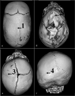 Рис. 1. Основные формы НеКС (по данным КТ с 3D-реконструкцией черепа). а — скафоцефалия (1 — отсутствие сагиттального шва); б — тригоноцефалия (2 — килевидная деформация лобной кости); в — ГКС (3 — отсутствие половины коронарного шва); г — ГЛС (4 — отсутствие половины лямбдовидного шва).