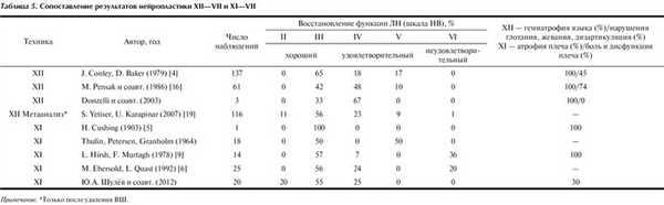 Результаты двух методов перекрестной нейропластики сопоставимы: симметрии лица в покое, полного смыкания глазной щели и произвольных мышц лица удается достичь у 70% больных (табл. 5).