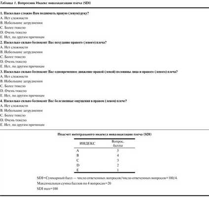 Отдельного внимания заслуживает использование специализированных шкал после заместительной нейропластики для оценки функции денервированного сегмента. После пластики VII—XII в нескольких работах используется Oral-Pharyngeal Disability Index [13]. Однако в доступной анализу литературе мы не обнаружили шкалы для оценки функции плечевого пояса после выключения добавочного нерва, что и послужило предпосылкой для создания специализированного инструмента оценки — Индекса инвалидизации плеча.