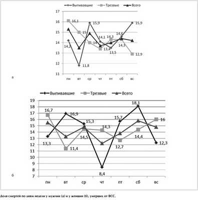 Таким образом, пик наступления ВСС в общей выборке мужчин и у не принимавших алкоголя перед смертью мужчин и женщин приходится на понедельник.