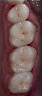 Оттиски можно делать обычным или цифровым методом, после чего из бис-акрилового материала изготавливают временные конструкции по стандартному протоколу. Важно отметить, что нужно использовать изолятор, чтобы бис-акриловый материал не присоединился к обработанной поверхности дентина. Небольшой участок дентина в центре зуба можно оставить обнаженным, чтобы обеспечить точечную связь временных конструкций с тканями зуба.