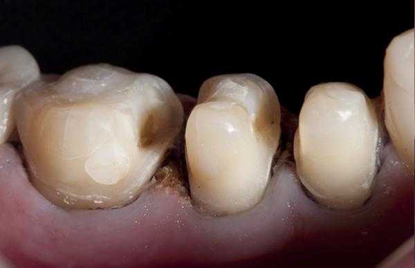 Разрушение твердых тканей зуба уходит под десну. Как и в предыдущем случае, эффективность применения реставрации зубов композитными материалами сомнительна. Адгезивные материалы, используемые при восстановлении, не могут обеспечить 100% надежного и долговечного прилегания композита к корню зуба в поддесневой области. Поэтому в подобных ситуациях следует отдать предпочтение зубным коронкам.
