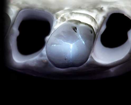 - Примерка и фиксация фарфоровой вкладки в зуб.