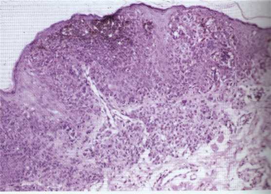 Больные со стационарным невусом находились под наблюдением, за время которого у одного больного появились признаки прогрессирования образования, а именно увеличение его размеров, покраснение, утолщение и некоторое усиление интенсивности окраски. Распыления пигмента не наблюдали. Как и другим больным с прогрессирующим невусом, ему была проведена операция удаления опухоли. За 5 лет наблюдения среди прооперированных пациентов мы не наблюдали ни одного рецидива. В первые недели послеоперационного периода наблюдалась гиперемия с формированием нежного конъюнктивального рубца. Изменений рефракции у больных также не отмечалось. Диагноз больных с невусом, с меланомой конъюнктивы во всех случаях был гистологически верифицирован. В гистопрепаратах невусов были обнаружены пролиферирующие меланоциты, которые формировали клеточные гнезда в базальном слое конъюнктивального эпителия (рис. 6). В препаратах удаленных меланом присутствовали веретеноклеточные, полигональные клетки, ограниченные эпителием конъюнктивы (рис. 7). Края резекции опухоли во всех препаратах интактны. В послеоперационном периоде больные на протяжении 5 нед получали интерферон α2-β в виде субконъюнктивальных инъекций 1 раз в неделю, а также в виде ежедневных трехкратных инстилляций. Препарат применяли с целью усиления местного клеточного иммунитета. В результате у 2 больных наблюдали кратковременное повышение температуры и общее недомогание, которое легко устранялось применением пероральных противовоспалительных нестероидных препаратов. Больным с меланомой на протяжении одного года после операции каждые 3 мес обязательно проводили УЗИ внутренних органов, исследование содержания ферментов печени в крови с целью своевременного выявления возможных метастазов, а также рентгенографию легких 1 раз в 6 мес. На протяжении последующих 4 лет больные были переведены на диспансерный учет 1 раз в 6 мес. Нужно отметить, что эти пациенты находятся на диспансерном учете пожизненно. За время наблюдения, который составил 4 года, мы не отмечали у них рецидивов или отдаленных метастазов. Рецидив невуса наступает при неполном его удалении. Гистологические исследования показали, что остающиеся невусные клетки индуцируют пролиферацию дендритических меланоцитов с образованием типичных невусных гнезд [5, 6]. Прогностически важными факторами для меланомы являются локализация опухоли, толщина опухоли, глубина инвазии меланомой подконъюнктивального слоя или слезного мясца, высокая митотическая активность, отсутствие лимфоидной инфильтрации, редкая встречаемость мелких полигональных клеток [7, 8]. Более благоприятное течение заболевания отмечается при локализации меланомы в области лимба [9]. Отсутствие рецидивов у наших больных объясняется радикальным удалением опухоли, что было подтверждено гистологически [10]. Локализация опухоли только на бульбарной конъюнктиве и в области лимба, отсутствие распространения на склеру и своды также улучшили витальный прогноз [11]. Злокачественная меланома чаще возникает у взрослых и пожилых. Меланома может возникнуть de novo или на фоне предшествующего меланоза или невуса. Особо опасными в этом отношении являются прогрессирующий невус и первичный приобретенный невус с грубой атипией мелких веретенообразных или эпителиоидных клеток. 