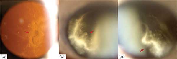 а — цветная фотография с использованием видеощелевой лампы при прямом освещении без применения линз: красная стрелка указывает на помутнение неправильной формы, расположенное в центральной зоне при переводе взгляда в направлении «вверх — прямо»; б, в — цветные фотографии с использованием видеощелевой лампы при непрямом освещении: крупное белоснежное помутнение (красная стрелка), которое трансформируется в разные формы и меняет положение в зависимости от положения глаза (б — при переводе взгляда в направлении «вправо — прямо», в — при движении глаза в направлении «влево — прямо»).