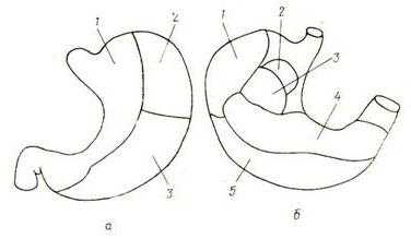 Желудок имеет достаточно специфическую форму. В нем можно выделить несколько отделов, которые отличаются в функциональном отношении и по своему гистологическому строению: кардиальный отдел, дно желудка, тело желудка, и пилорический отдел.
