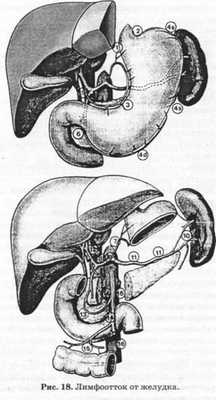 Лимфатическую систему желудка делят на пять отделов. По малой кривизне расположены: zona cardiaca, zona coronaria, zona pylorica. Со стороны большой кривизны — zona gastroepiploica sinistra et zona gastro-epiploica dextra соответственно. Границы каждого из перечисленных отделов переходят друг в друга, а лимфатические сосуды в стенке желудка образуют общую анастомозирующую сеть. Первыми на пути лимфы, оттекающей от желудка, являются лимфатические узлы, расположенные по малой и большой кривизне. Далее идут паракардиальные, пара- (ретро-) пилорические, ретропанкреатические, параортальные и медиастинальные лимфатические узлы. Современная система лимфооттока желудка включает в себя 16 групп лимфоузлов, расположенных в полости живота, и 2 группы в полости груди (рис. 18).