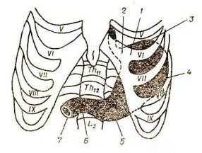 • дно - Th X (V ребро по левой среднеключичной линии):