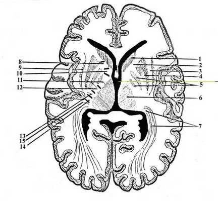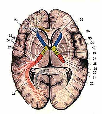 Рис. 33. Базальные ядра и капсулы полушария (горизонтальный срез)