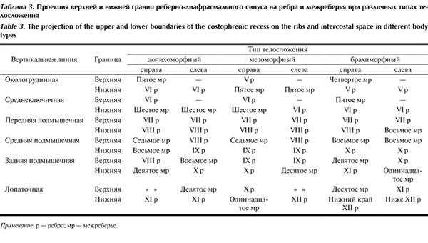 Анатомические исследования проводили в ГКУЗОТ ПК «Пермское краевое бюро судебно-медицинской экспертизы». Уточнение границ ТАО и уточнение клинико-анатомических характеристик ТАР провели по результатам судебно-медицинского исследования 81 трупа пострадавших с ТАР. Типовые границы реберно-диафрагмального плеврального синуса определяли у 90 трупов мужского пола второго периода зрелого возраста (по 30 объектов долихо-, мезо- и брахиморфного типов телосложения) без патологии груди. Выбор объектов исследования обусловлен данными литературы о том, что среди пострадавших с ТАР преобладают мужчины зрелого возраста [14].
