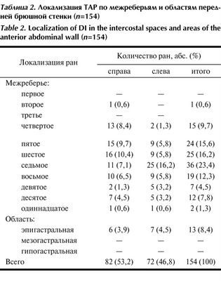 Для диагностики ТАР выделяют торакоабдоминальную область (ТАО), расположение раны в которой делает особенно высокой (10—50%) вероятность ПД и служит показанием к различным диагностическим операциям [4, 5—7, 10]. Границы этой области определяют по-разному: верхняя граница — от IV до VI ребра, нижняя — от XI ребра до уровня пупка и подвздошных гребней [5—7].