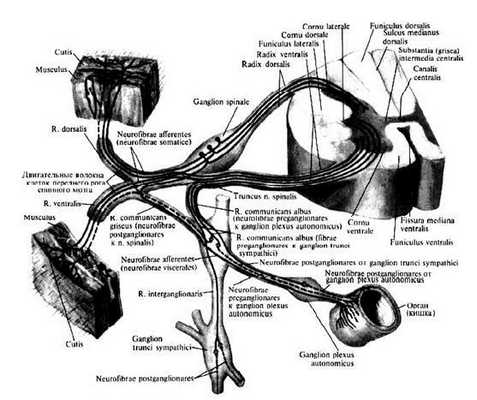 Рис. 2. Ход волокон спинномозговых нервов и их связь с симпатическим стволом.