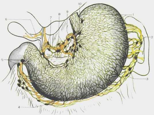 1 — vasa lymphatica; 2 — nodi lymphatici lienaies [splenic!]; 3— nodi lymp-hdtici gastroomentales sinistri; 4 — nodi lymphatici gastroomentales dextri; 5 — nodi lymphatici subpylorici; 6 — nodus lymphaticus suprapyloricus; 7 — nodi lymphatici hepatici; 8 — nodi lymphatici cocliaci; 9 — nodi lymphatici gastrici sinistri; 10— nodi lymphatici cardiaci (BNA) [anulus lymphaticus cardiae].