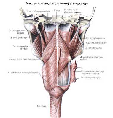Начавшись на различных пунктах: на костях основания черепа (tuberculum pharyngeum затылочной кости, processus pterygoideus клиновидной), на нижней челюсти (linea mylohyoidea), на корне языка, подъязычной кости и хрящах гортани (щитовидном и перстневидном), - волокна мышц каждой стороны идут назад и соединяются друг с другом, образуя по средней линии глотки шов, raphe pharyngis. Нижние волокна нижнего сжимателя глотки тесно связаны с мышечными волокнами пищевода.