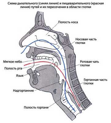 Акт глотания. Поскольку в глотке происходит перекрест дыхательных и пищеварительных путей, то существуют специальные приспособления, отделяющие во время акта глотания дыхательные пути от пищеварительных. Сокращением мышц языка пищевой комок прижимается спинкой языка к твердому нёбу и проталкивается через зев. При этом мягкое нёбо оттягивается кверху (сокращением mm. levator veli palatini и tensor veli palatini) и приближается к задней стенке глотки (сокращением m. palatopharyngeus).