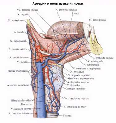 Сосуды и нервы глотки. В стенке глотки разветвляются восходящая глоточная артерия (из наружной сонной артерии), глоточные ветви (из щитошейного ствола — ветви подключичной артерии), глоточные ветви (из восходящей небной артерии— ветви лицевой артерии). Венозная кровь оттекает через глоточное сплетение, затем глоточные вены во внутреннюю яремную вену. Лимфатические сосуды глотки впадают в заглоточные и глубокие латеральные (внутренние яремные) лимфатические узлы. Иннервация глотки осуществляется ветвями языкоглоточного (IX пара) и блуждающего (X пара) нервов, а также через гортанно-глоточные ветви (из симпатического ствола), которые образуют в стенке глотки нервное сплетение.
