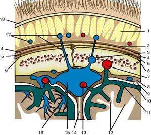 | Клетчаточные пространства свода черепа: 1.Подкожная клетчатка. Соединительнотканные перемычки плотно сращены с кожей и сухожильным шлемом, а также с адвентицией кровеносных сосудов, что создает возможность скальпирования и сильного кровотечения. 2.Подапоневротическое пространство (широко распространяется). 3.Поднадкостничное пространство (повторяет контуры кости). | ![]() | 1 - tela subcutanea; 2 - galea aponeurotica; 3 - vv. diploicae; 4 - подапоневротическая клетчатка; 5 - pericranium; 6 - поднадкостничная клетчатка; 7, 13 - пахионовы грануляции; 8 - dura mater; 9 - spatium subdurale; 10 - arachnoidea mater; 11 - spatium subarachnoidal; 12 - encephalon; 14 - falx cerebri; 15 - sinus sagittalis; 16 - vv. cerebri; 17 - v. subcutanea, v. emissaria; 18 - кожа |