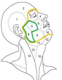 Лицо ограничено: margo supraorbitalis - porus acusticus externus - margo posterior ramus mandibula
