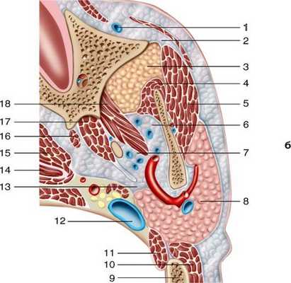 глубокие клетчаточные пространства лица на горизонтальном распиле головы: 1 - лицевая вена; 2 - межмышечное клетчаточное пространство щеки; 3 - жировой комок щеки; 4 - височная мышца; 5 - жевательная мышца; 6 - височно-крыловидная клетчаточная щель; 7 - межкрыловидная клетчаточная щель; 8 - околоушная слюнная железа; 9 - сосцевидный отросток; 10 - грудино-ключично-сосцевидная мышца; 11 - заднее брюшко двубрюшной мышцы; 12 - внутренняя яремная вена; 13 - переднее окологлоточное пространство; 14 - полость глотки; 15 - мышца, поднимающая нёбную занавеску; 16 - мышца, напрягающая нёбную занавеску; 17 - медиальная крыловидная мышца; 18 - латеральная крыловидная мышца