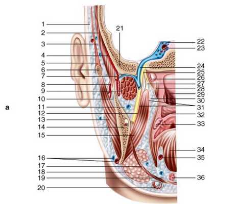 а - задний отдел нижнечелюстной ямки височной кости и ветви нижней челюсти: 1 - подкожная клетчатка височной области; 2 - височная мышца; 3 - подапоневротическая клетчатка височной области; 4 - глубокий слой клетчатки височной области; 5 - межапоневротическая клетчатка височной области; 6 - скуловая дуга; 7 - височно-крыловидная клетчаточная щель; 8 - сухожилие височной мышцы; 9 - латеральная крыловидная мышца; 10 - поджевательное клетчаточное пространство; 11 - крыловидно-межчелюстное клетчаточное пространство; 12 - язычный нерв; 13 - жевательная мышца; 14 - нижняя челюсть; 15 - медиальная крыловидная мышца; 16 - лицевые артерия и вена; 17 - челюстно-подъязычная мышца; 18 - поднижнечелюстная слюнная железа; 19 - клетчатка дна полости рта; 20 - двубрюшная мышца; 21 - наружное основание черепа; 22 - пещеристый венозный синус; 23 - внутренняя сонная артерия; 24 - связь крыловидного венозного сплетения с пещеристым синусом; 25 - нижнечелюстной нерв; 26 - слуховая труба; 27 - нерв мышцы, напрягающей нёбную занавеску; 28 - мышца, напрягающая нёбную занавеску; 29 - полость глотки; 30 - окологлоточное пространство; 31 - собственная фасция медиальной крыловидной мышцы; 32 - мягкое нёбо; 33 - нёбная миндалина; 34 - язык; 35 - язычная артерия; 36 - подбородочно-подъязычная мышца