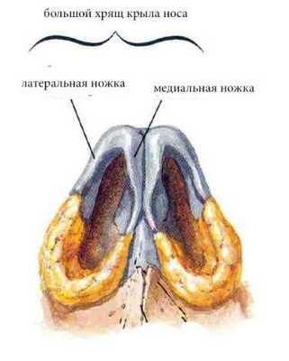 Кончик носа образован большими крыльными хрящами, каждый из которых имеет медиальную (срединную) и латеральную (боковую) ножки. Латеральная и медиальная ножка объединяясь, образуют своды или арки носа.