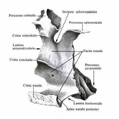 Перпендикулярная пластинка (lamina perpendicularis) участвует в образовании латеральной стенки полости носа. На латеральной поверхности этой пластинки расположена большая небная борозда (sulcus palatinus major). Она вместе с одноименными бороздами верхней челюсти и крыловидного отростка клиновидной кости образует большой небный канал (canalis palatinus major). На медиальной поверхности перпендикулярной пластинки имеются два горизонтальных гребня. Верхний решетчатый гребень (crista ethmoidalis) служит для прикрепления средней носовой раковины, а нижний раковинный гребень (crista conchalis) - нижней носовой раковины.