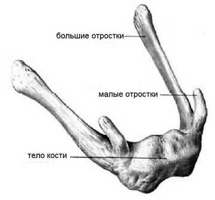 Эта кость состоит из тела и двух пар отростков: больших и малых рогов, к которым прикрепляются многие мышцы шеи.